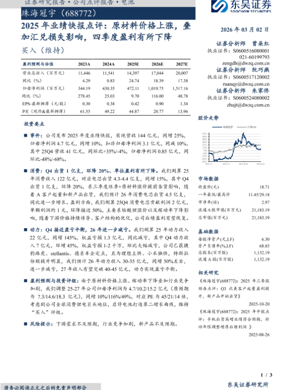 【东吴证券】【202603】2025年业绩快报点评:原材料价格上涨,叠加汇兑损失影响,四季度盈利有所下降-3页 证券期货研究报告