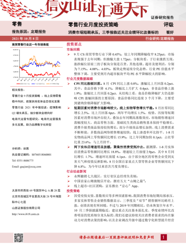 【山西证券】【20211008】零售行业月度投资策略:消费市场短期承压,三季报临近关注业绩环比改善标的-16页 行业研究