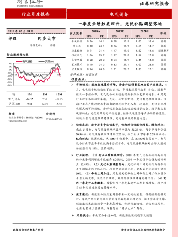 【财信证券】【20190508】电气设备行业月度报告:一季度业绩触底回升,光伏补贴调整落地-17页 行业研究