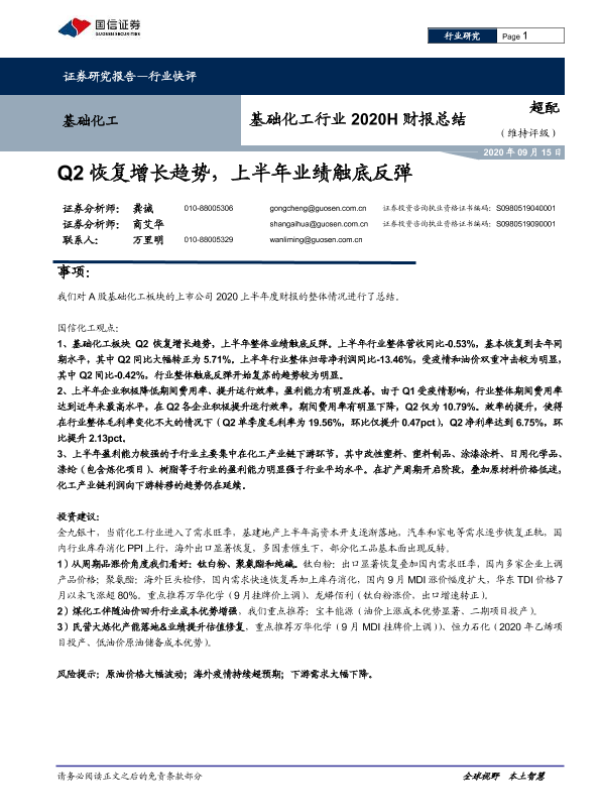 【国信证券】【20200915】基础化工行业2020H财报总结:Q2恢复增长趋势,上半年业绩触底反弹-9页 行业研究