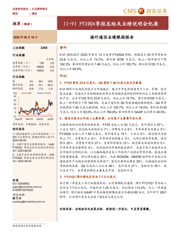 【海通证券】【20200816】20200816-招商证券-海外通信业绩跟踪报告:II-VIFY20Q4季报总结及业绩说明会纪要-15页 行业研究