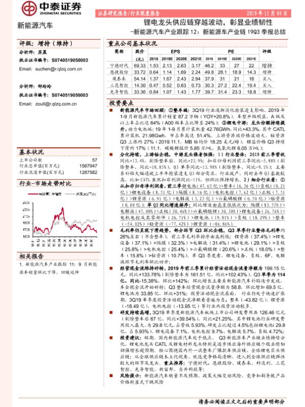 【中泰证券】【20191104】新能源汽车产业跟踪12:新能源车产业链19Q3季报总结-锂电龙头供应链穿越波动,彰显业绩韧性-28页 行业研究