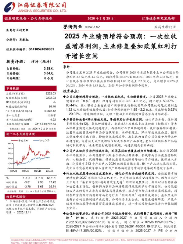 【江海证券】【202512】黑龙江新质生产力公司深度报告(首次覆盖)-誉衡药业-002437.SZ:双核心业务筑牢基本盘,多矩阵产品贡献增量 – 2025.12.11-5页 证券期货研究报告