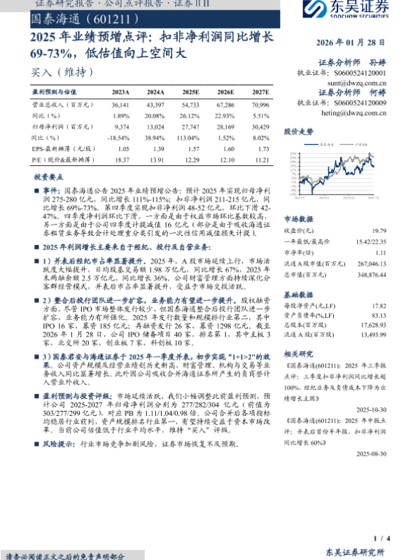【东吴证券】【202601】2025年业绩预增点评:扣非净利润同比增长 69-73%,低估值向上空间大-4页 证券期货研究报告