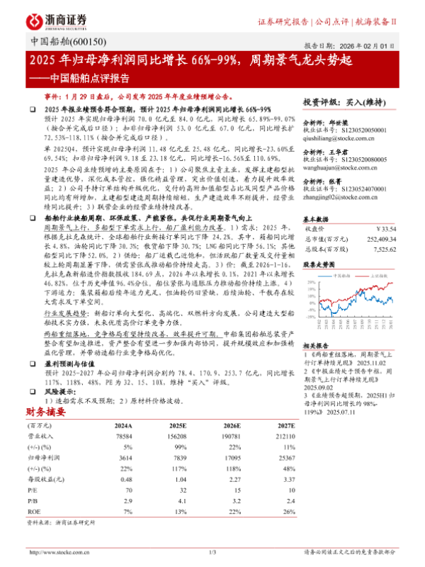 【浙商证券】【2025】中国船舶点评报告——2025年归母净利润同比增长 66%-99%,周期景气龙头势起-3页 证券期货研究报告