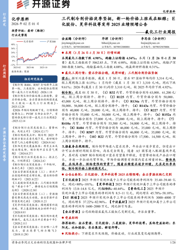 【开源证券】【202602】氟化工行业周报:三代制冷剂价格淡季坚挺,新一轮价格上涨或在酝酿;巨化股份、昊华科技等发布2025业绩预增公告-28页 证券期货研究报告