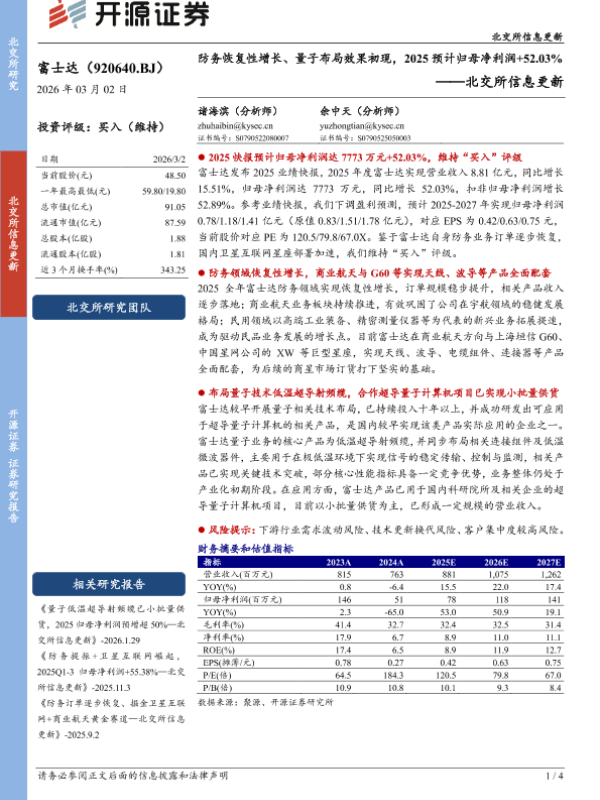 【开源证券】【202603】富士达(920640.BJ)北交所信息更新:防务恢复性增长、量子布局效果初现,2025预计归母净利润+52.03%-4页 证券期货研究报告