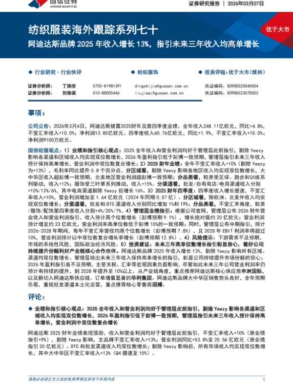 【国信证券】【202602】纺织服装海外跟踪系列七十:阿迪达斯品牌2025年收入增长13%,指引未来三年收入均高单增长-12页 证券期货研究报告