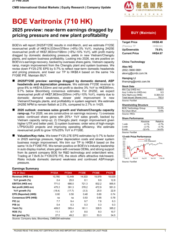 【CMB International Global Markets】【202602】BOE Varitronix(710 HK)- 2025 preview near-term earnings dragged by pricing pressure and new plant profitability-6页 证券期货研究报告