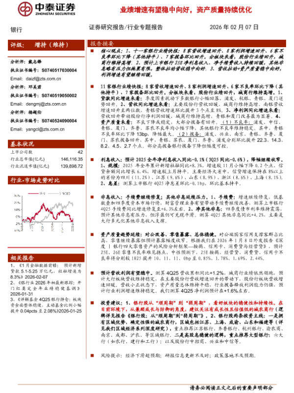 【中泰证券】【202602】银行业:前瞻|上市银行2025年年报,业绩增速有望稳中向好,资产质量持续优化-10页 证券期货研究报告