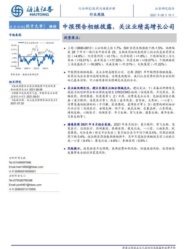 【海通证券】【20210815】医药与健康护理行业周报:中报预告相继披露,关注业绩高增长公司-5页 行业研究