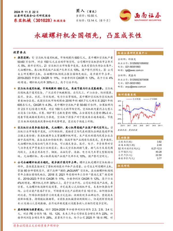 【西南证券】【20241122】东亚机械-301028.SZ-永磁螺杆机全国领先,凸显成长性-36页 行业研究