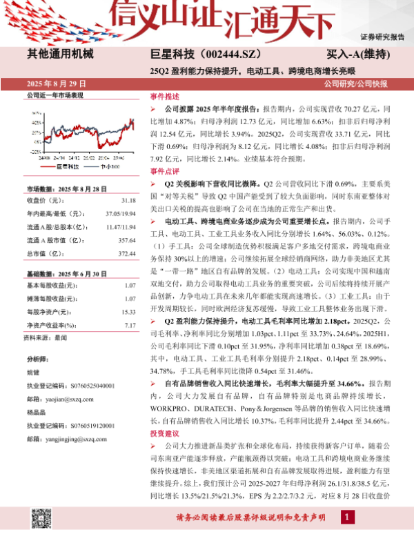 【山西证券】【20250829】巨星科技-25Q2盈利能力保持提升-电动工具-跨境电商增长亮眼-5页 证券期货研究报告