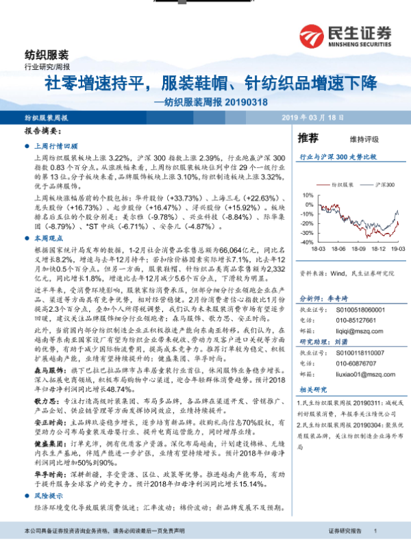 【民生证券】【20190318】20190318-民生证券-纺织服装周报:社零增速持平,服装鞋帽、针纺织品增速下降-11页 行业研究