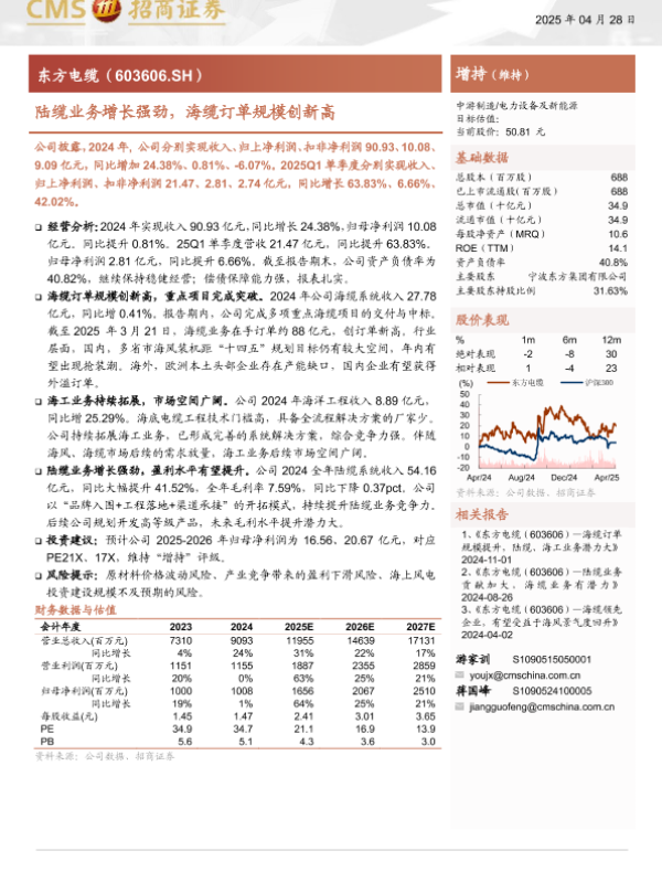 【海通证券】【20250428】东方电缆(603606)陆缆业务增长强劲,海缆订单规模创新高-10页 公司研究