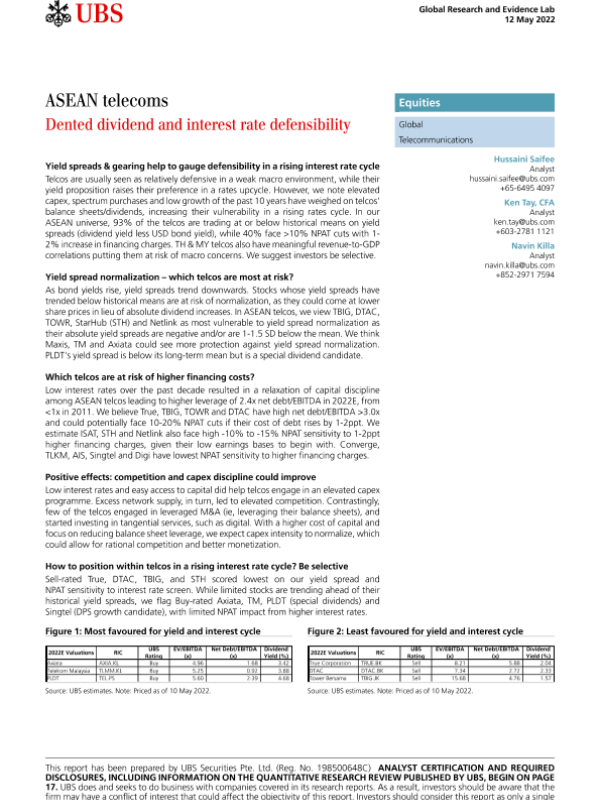 【瑞银】【20220512】瑞银-全球电信行业-东盟电信-削弱了股息和利率的可防卫性-24页 行业研究