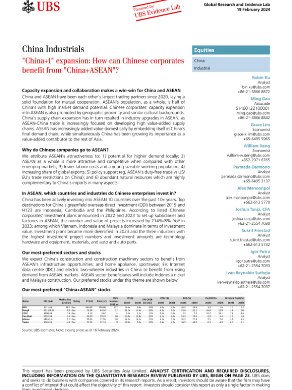 【UBS Securities Asia Limited】【20240219】UBS Equities-China Industrials 'China+1' expansion How can Chinese corporates benefit from 'China+ASEAN'?-33页 行业研究