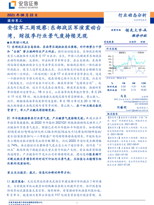 【安信证券】【20210822】安信军工周观察:东部战区军演震动台湾,财报季行业景气度持续兑现-12页 行业研究