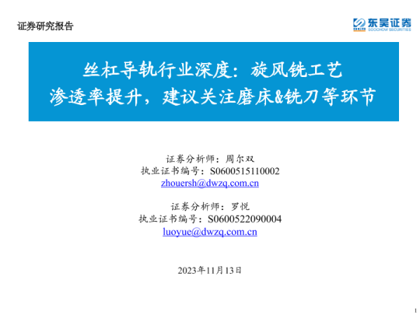 【东吴证券】【20231113】丝杠导轨行业深度:旋风铣工艺渗透率提升-建议关注磨床&铣刀等环节-39页 行业研究