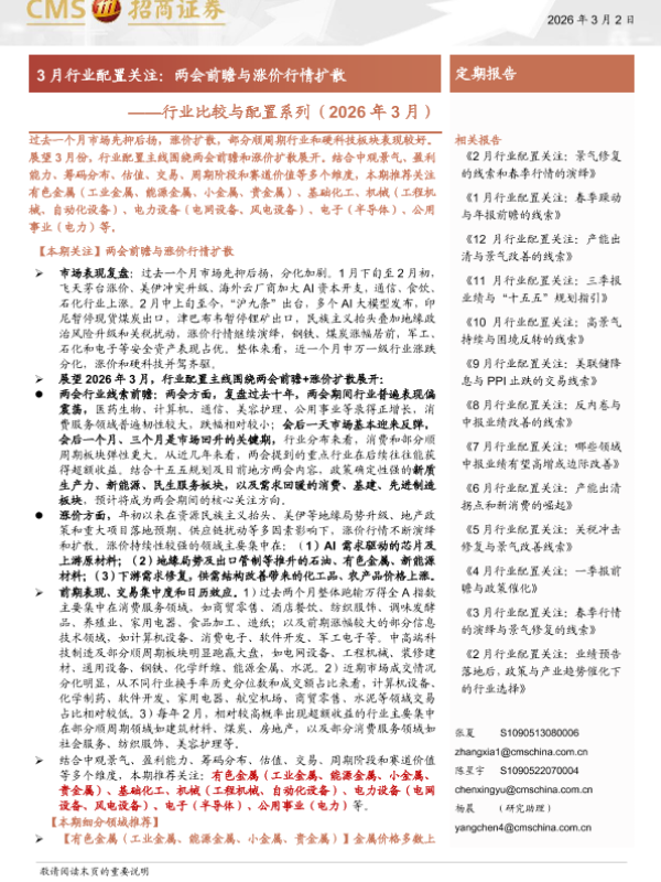 【海通证券】【202603】行业比较与配置系列(2026年3月):3月行业配置关注,两会前瞻与涨价行情扩散-43页 证券期货研究报告