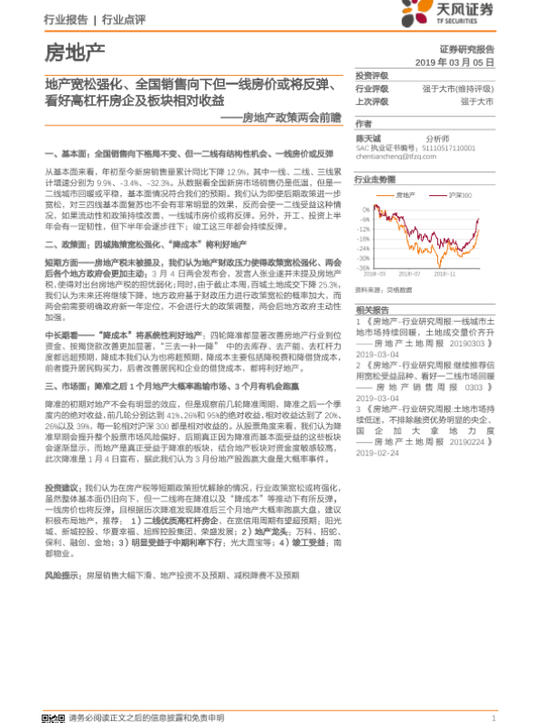 【天风证券】【20190305】房地产政策两会前瞻:地产宽松强化、全国销售向下但一线房价或将反弹、看好高杠杆房企及板块相对收益-7页 行业研究