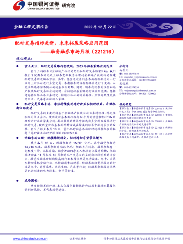 【银河证券】【20221222】融资融券市场月报:配对交易指标更新,未来拓展策略应用范围-24页 行业研究