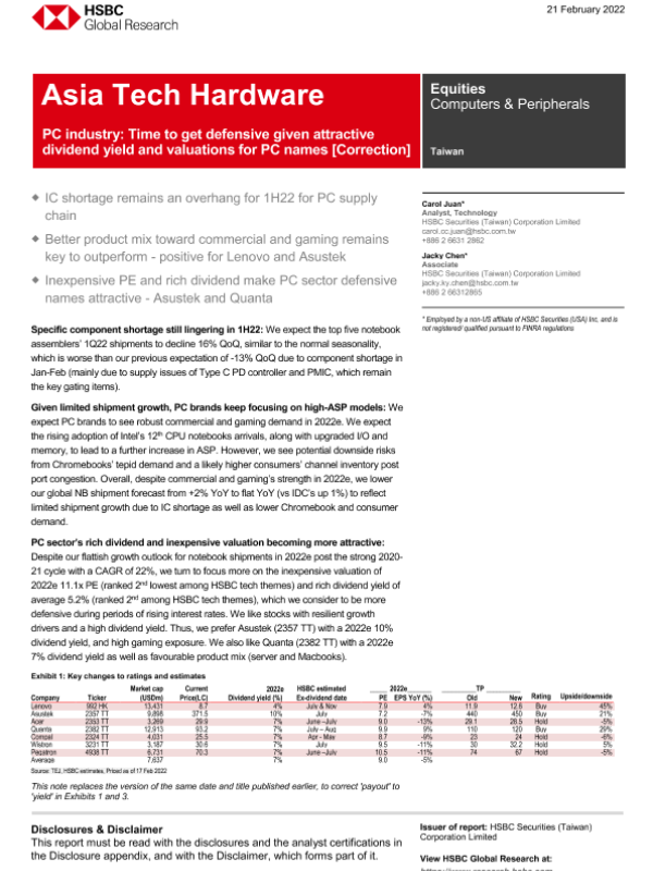 【HSBC Securities(Taiwan) Corporation Limited】【20220221】HSBC-亚太地区科技硬件行业-个人电脑行业:鉴于个人电脑品牌具有吸引力的股息率和估值,是时候采取防御措施了-33页 行业研究