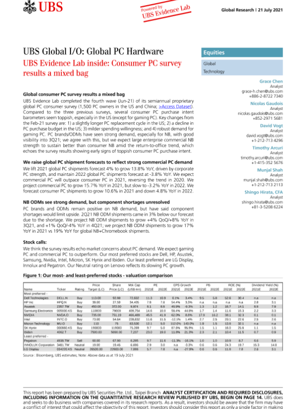 【瑞银】【20210721】全球科技行业-个人电脑硬件:消费者个人电脑调查结果喜忧参半-21页 行业研究