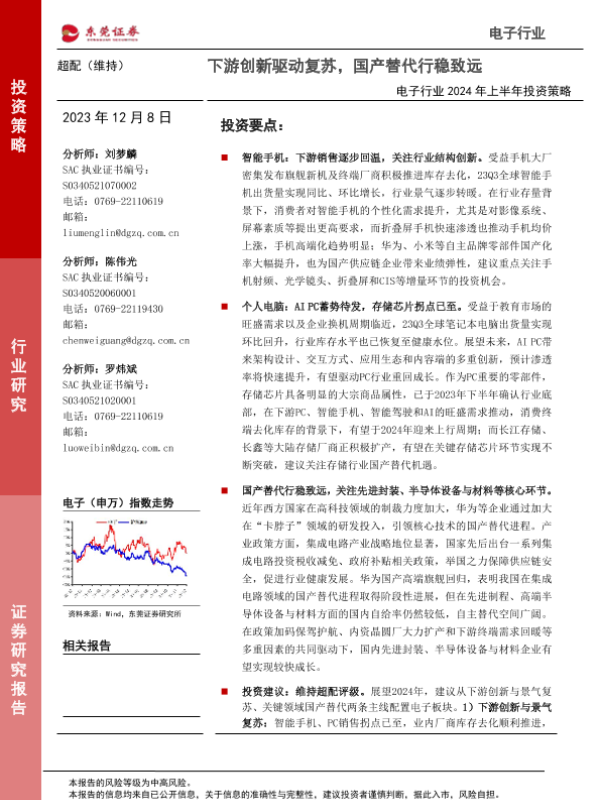 【东莞证券】【20231208】电子行业2024年上半年投资策略:下游创新驱动复苏,国产替代行稳致远-63页 行业研究