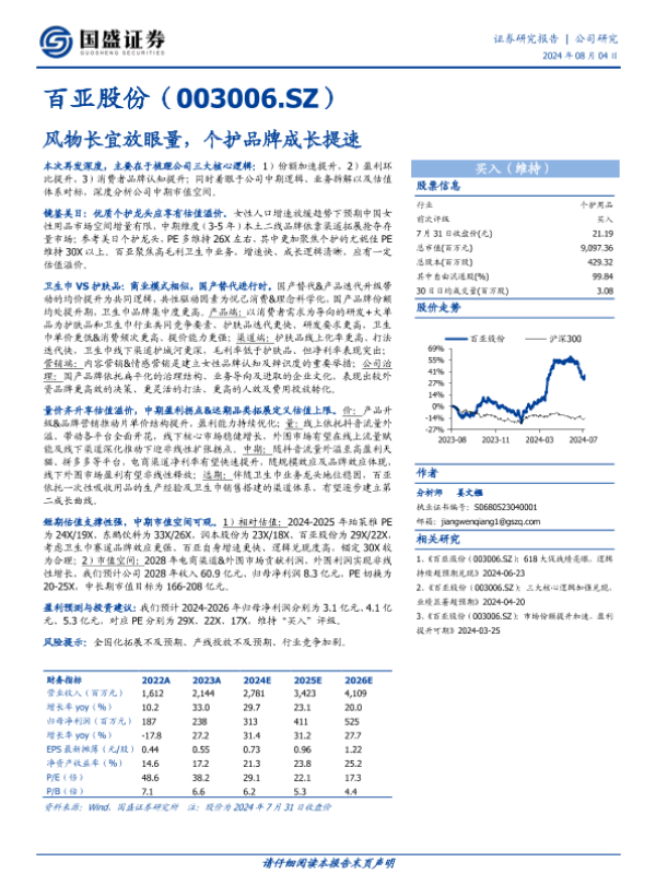 【国盛证券】【20240804】百亚股份(003006)风物长宜放眼量,个护品牌成长提速-24页 行业研究