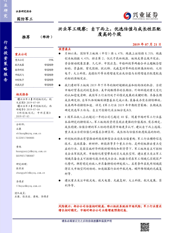 【兴业证券】【20190721】兴业军工观察:自下而上,优选估值与成长性匹配度高的个股-4页 行业研究