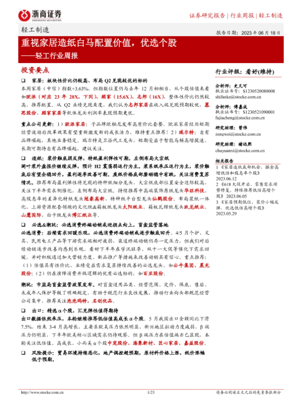 【浙商证券】【20230618】轻工行业周报:重视家居造纸白马配置价值,优选个股-23页 行业研究