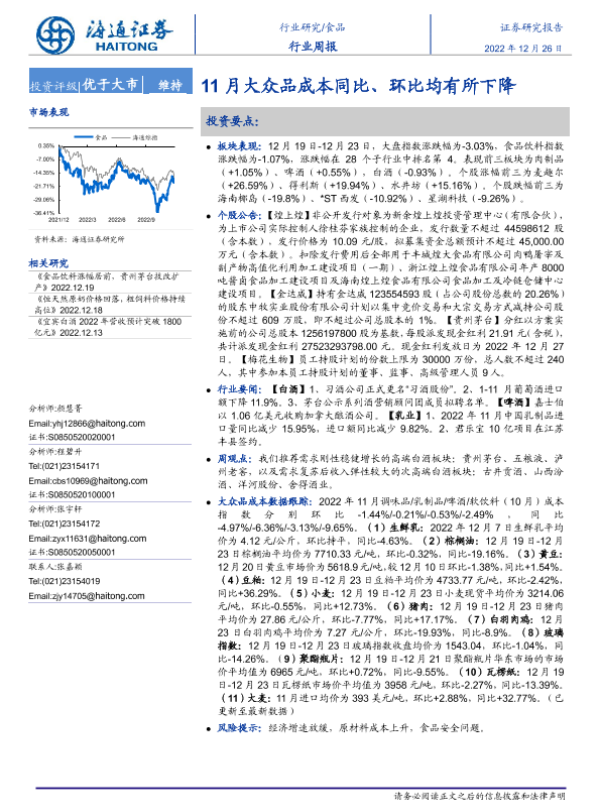 【海通证券】【20221226】食品行业周报:11月大众品成本同比、环比均有所下降-19页 行业研究