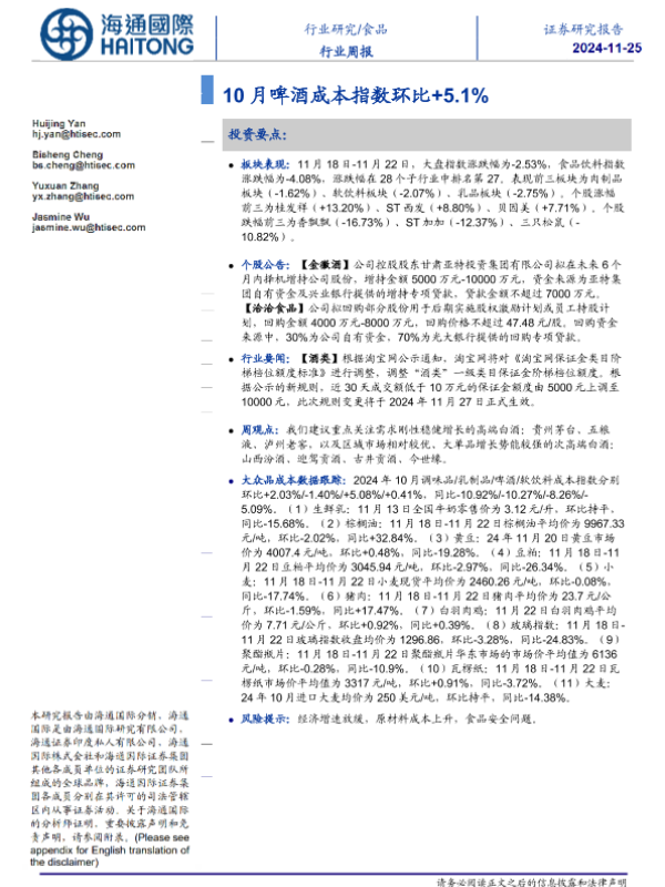 【海通国际】【20241125】20241125-海通国际-食品行业周报:10月啤酒成本指数环比+5.1%-22页 行业研究