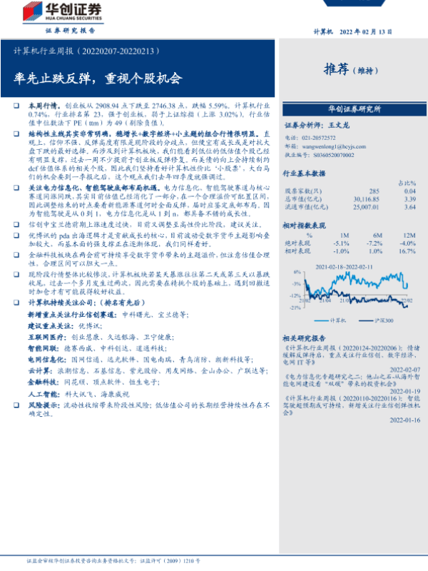 【华创证券】【20220213】20220213-华创证券-计算机行业周报:率先止跌反弹,重视个股机会-4页 行业研究