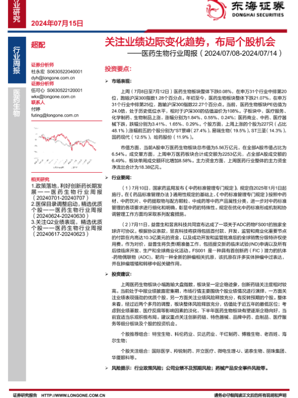 【东海证券】【20240715】关注业绩边际变化趋势,布局个股机会-11页 行业研究