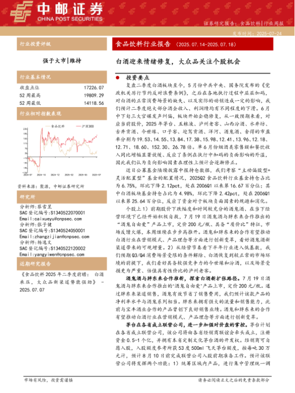 【中邮证券】【20250724】食品饮料行业报告:白酒迎来情绪修复,大众品关注个股机会-18页 行业研究