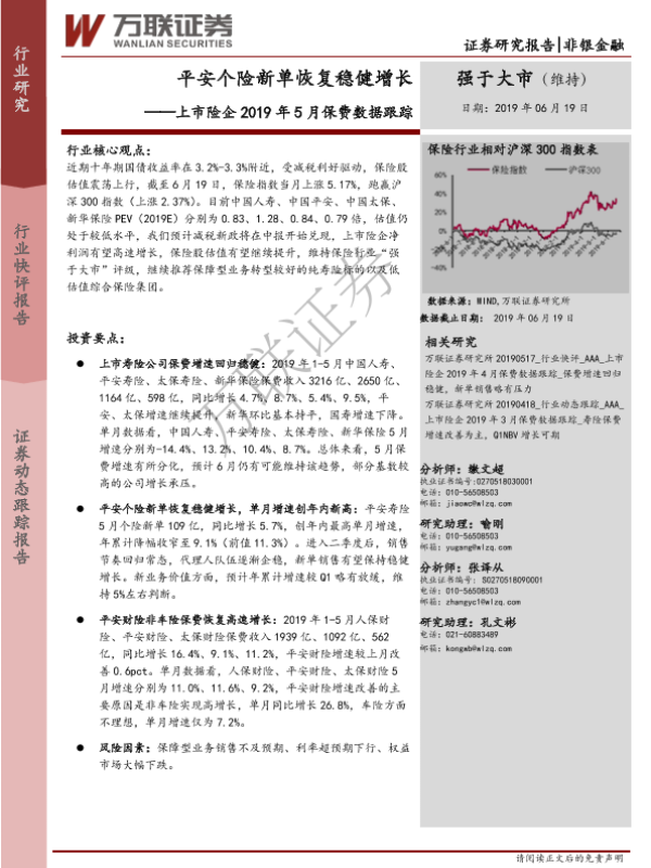 【万联证券】【20190619】上市险企2019年5月保费数据跟踪:平安个险新单恢复稳健增长-3页 行业研究