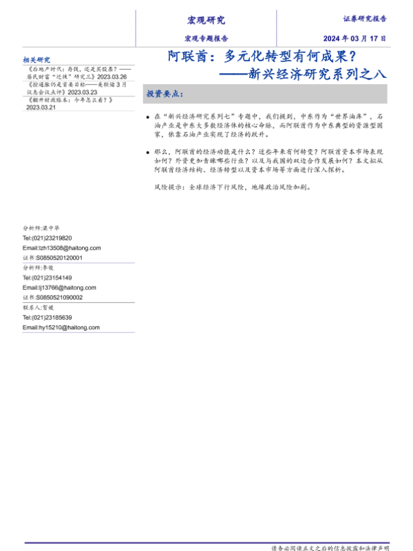 【海通证券】【20240317】阿联酋:多元化转型有何成果?——新兴经济研究系列之八-12页 行业研究