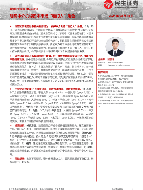 【民生证券】【20240818】非银行业周报:明确中介机构资本市场“看门人”角色-12页 行业研究