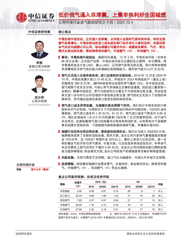 【中信证券】【20201204】低价俄气通入京津冀,上量串换利好全国城燃-4页 行业研究
