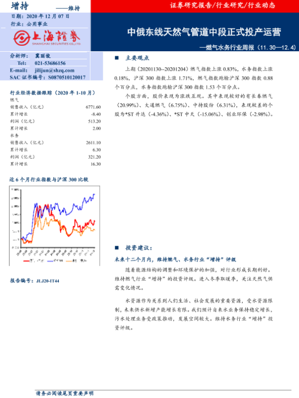 【上海证券】【20201207】燃气水务行业周报:中俄东线天然气管道中段正式投产运营-7页 行业研究