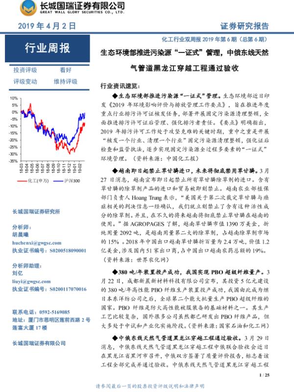【长城国瑞证券】【20190402】化工行业双周报2019年第6期(总第6期):生态环境部推进污染源“一证式”管理,中俄东线天然气管道黑龙江穿越工程通过验收-25页 行业研究