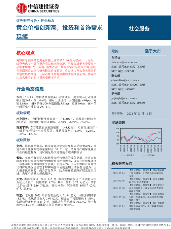 【中信建投证券】【20240311】社会服务行业:黄金价格创新高,投资和首饰需求延续-29页 行业研究