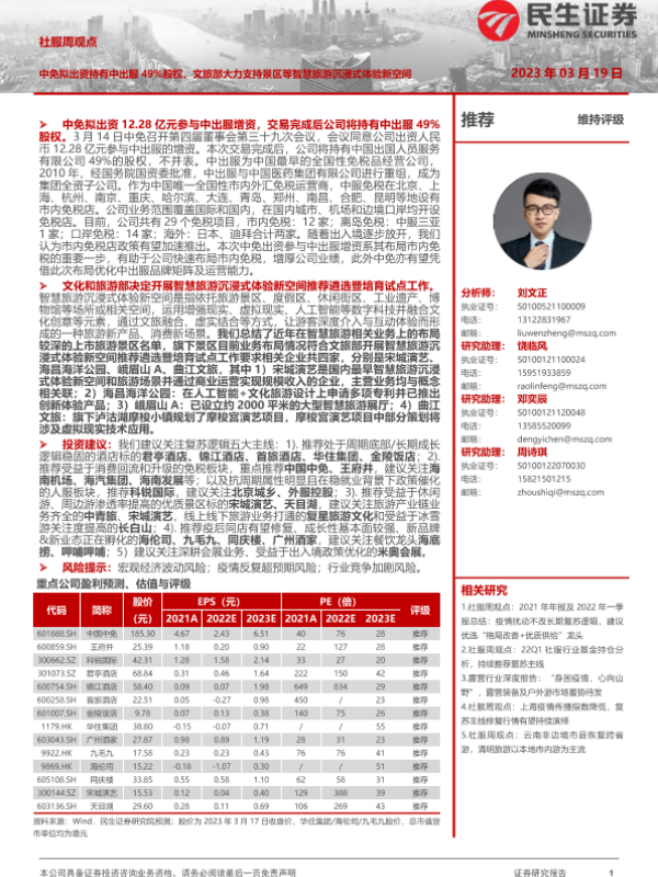 【民生证券】【20230319】社服周观点:中免拟出资持有中出服49%股权,文旅部大力支持景区等智慧旅游沉浸式体验新空间-26页 行业研究