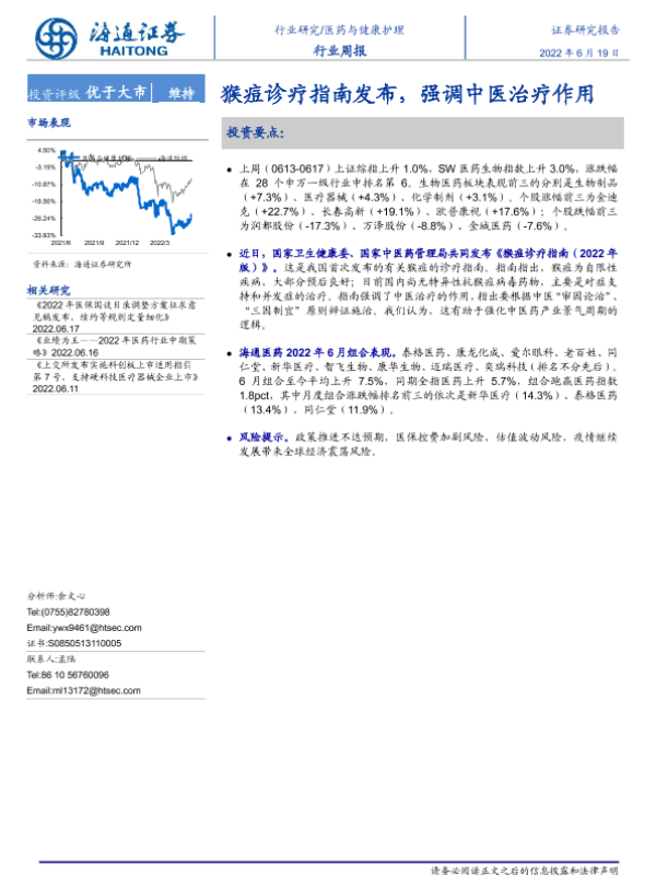 【海通证券】【20220619】医药与健康护理行业周报:猴痘诊疗指南发布,强调中医治疗作用-6页 行业研究