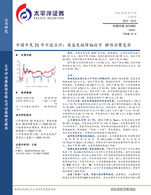 【太平洋证券股份有限公司证券研究报告】【20250827】中国中免-中国中免25年中报点评:离岛免税降幅收窄静待消费复苏-5页 证券期货研究报告