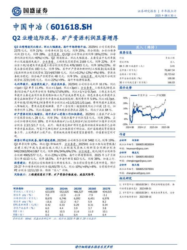 【国盛证券】【20250830】中国中冶(601618.SH)-Q2业绩边际改善,矿产资源利润显著增厚-3页 证券期货研究报告