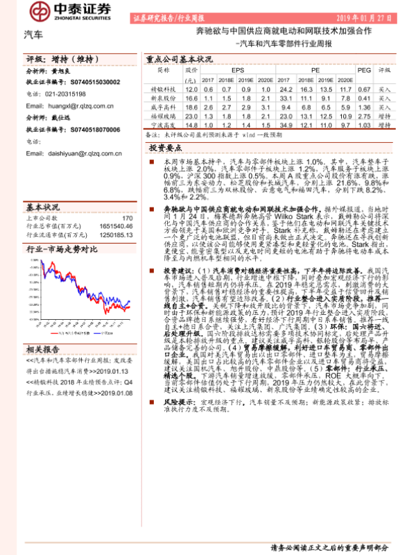 【中泰证券】【20190127】汽车和汽车零部件行业周报:奔驰欲与中国供应商就电动和网联技术加强合作-9页 行业研究