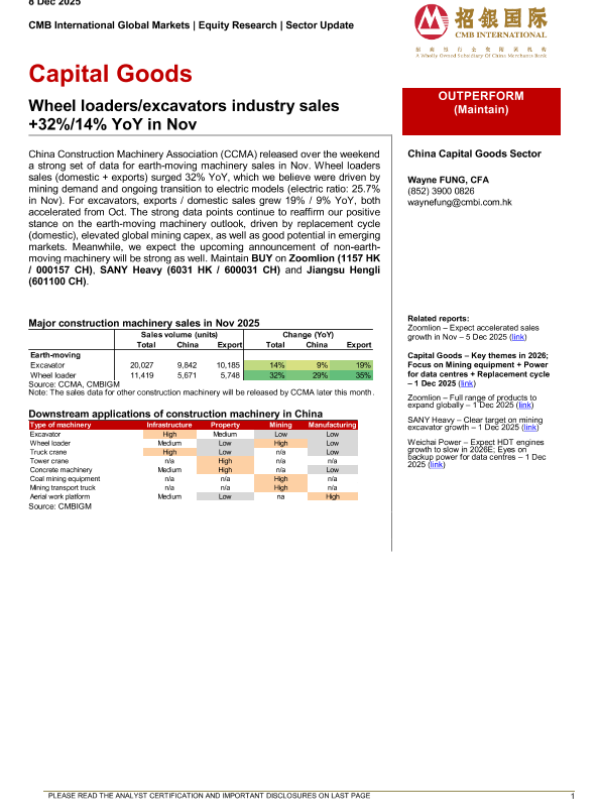 【CMB International Global Markets】【202512】Capital Goods- Wheel loaders/excavators industry sales+32%/14% YoY in Nov-4页 证券期货研究报告